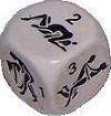 from the face of the new die. Sometimes dice are marked with the numerals 1, 2, 3, 4, 5, 6 instead of spots. This is a Role Playing Game (RPG) convention and, of course, they can be used in exactly the same way as the standard ordinary spotted dice. Similarly, but less common, some dice are marked with Roman numerals - I, II, III, IV, V, VI. The six numbers on a standard dice can also be represented by words spelling out the values: "one", "two", "three", "four", "five", "six". You may come across dice that are not marked with the usual round spots but use a small symbol as a replacement for the common and usual circular dot. They are marked with the symbol conventionally so each face has one up to six symbols arranged like an ordinary standard die's spots. Symbols used include - stars, hearts, dollar signs, champagne glasses, pumpkins, shamrocks, Christmas trees, horseshoes.