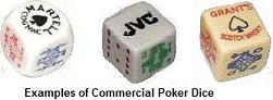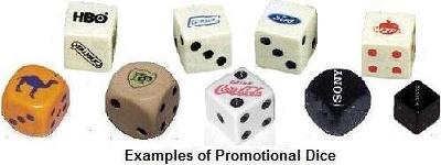 Novelty, Souvenir & Promotional Dice Dice have been manufactured for many different commercial products, companies, sports, sports teams, locations, and have been made with unusual aspects to their design or in different shapes from ordinary standard dice. Here you can learn about a whole range of novelty, souvenir and promotional dice. There are a vast range of promotional dice available that you may occasionally come across. Literally thousands of commercial products and companies have had their own dice manufactured for promotional purposes. Often the one-spot is simply replaced with a commercial logo and/or brand name and/or slogan, although not always.