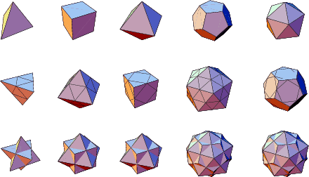 Duality Hexahedrons/cubes have 6 faces and 8 vertices (corners) while Octahedrons have 8 faces and 6 vertices. Dodecahedrons have 12 faces and 20 vertices while Icosahedrons have 20 faces and 12 vertices. The converse relationship between faces and vertices is expressed as a concept known as duality. Dodecahdrons are dual with Icosahedrons. Hexahedrons/cubes are dual with Octahedrons. Tetrahedrons have 5 vertices and are dual with themselves. If you look at the illustration below you can see that each shape's vertices intersect and protrude through the centre of their dual's faces.