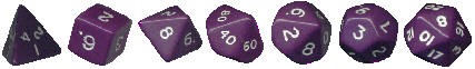 along the lines of Dungeons and Dragons use In RPGs the dice are used to gain strength and power in specific categories. Wizardry and sorcery in ancient times may be expressed in terms of dice throws. Players take on character identities and may become elves, knights, wizards, etc. These characters will have abilities like speed, strength and magic which can be determined by the throw of the dice. In Collectable Dice Games (CDGs) players must buy or collect particular dice to use against opposing players, giving them superior abilities, powers and the advantage. Consequently, some dice are rarer than others. These small plastic polyhedral shapes hold the key to a RPG or CDG game's course and outcome. There is a shorthand used by game players to express the results and the type of dice used in a game. Read about standard dice notation for an explanation. Polyhedral dice are usually numbered with numerals not spots. Sometimes they are numbered more than once with the same numeral. d20s are sometimes numbered twice with the numbers 0 - 9. It is also possible that some numbers will be marked more frequently than others. For example, a d6 marked 2, 3, 3, 4, 4, 5. Dice like these are known as averaging dice. They change the odds of particular totals being thrown and prevent extreme results. Unscrupulous players may use crooked polyhedral dice marked twice with a particular number to give themselves better odds. Many polyhedral dice are not marked with numbers but are marked with symbols, categories or instructional words. These dice are usually specifically used for their own particular RPG or CDG although not always. The geometry of these polyhedral shapes is a science in itself and has fascinated scholars and mathematicians through the ages. Read polyhedral dice geometry if you want to learn about the mathematics and variety of these dice solids. Polyhedral dice often come in standard sets of seven - d4, d6, d8, 2d10, d12, d20. One d10 will be marked in tens, 0 to 90, so it can be used with the other as percentile dice (d%).