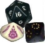 The standard polyhedral set above is only part of the range of solid shapes used for dice. You may come across all sorts of dice shapes and there are many patents in existence detailing interesting and new ideas and weird, exotic solid forms. Polyhedral dice come in a range of attractive finishes, colours and materials to appeal to a RPG or CDG gamer's aesthetic senses. You can even find them made from real semi-precious stones and minerals. RPG and CDG gamers' love of dice manifests itself in the adoption of new interesting or unusual dice, found, bought or borrowed, which are incorporated into the original game play adding a new dimension or aspect to the proceedings. You can find other sites for polyhedral dice and their associated games by clicking on RPG and CDG links. Polyhedral dice may have gained widespread use and popularity with the advent of Role Playing Games in the 20th-century but some ancient examples have been found also. A Roman d20 from the 2nd-century AD exists although how it was used is unknown. A variation on cubic poker dice is sometimes found in polyhedral poker dice.