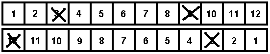 Play: Each player in turn throws three dice and crosses off any values, drawn up on their paper, using either row and in any order they wish according to the values thrown. A player may use combinations of dice values or the value of a single die, but each number rolled may only be used once. For example, if a player has rolled 2, 3, 5, they may cross off any of the following sets of numbers on their paper: