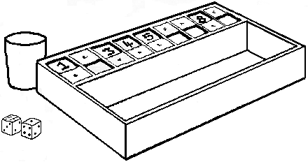 Shut The Box This traditional dice game, played in the North of France, requires two dice and, usually, a special wooden box. The box has a tray for rolling the dice in, and a row of numbers, from 1 to 9, with sliding covers which are used to conceal the digits. You can play without the box by drawing up a row of numbered squares on a piece of paper and using coins or counters to cover them as necessary. Play: Each player takes it in turn to throw the dice as many times as they can and try and cover as many numbers as possible. They cover the numbers by adding the dice values thrown to form a total and then choosing numbers to cover that add up to the same amount. For example, if a player has thrown a total of 8, they may cover either the 1 and 7; 2 and 6; 3 and 5; 1, 2 and 5; or the 8. They continue to throw the dice and cover numbers that are exposed until they fail to cover a combination that is equal to the dice total. A player has the option of throwing a single die once the 7, 8 and 9 are covered. A player's score is the total of the numbers still exposed at the end of their turn. The player with the lowest score after each player has had their turn, is the winner. Variations: There are boxes available with 10, 11 or 12 numbers. |