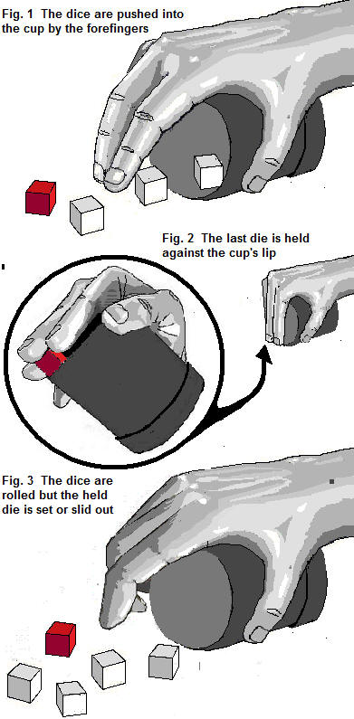 - Dice Control A simple false dice roll with any dice cup, known as the Hold Up, can be used by cheats in multi-dice games to give themselves the advantage.. This move can be used in any three to five dice game like Buck Dice, Poker Dice, Cubilette, etc., using any dice cup, including ribbed and tripped dice cups. The cheat only controls the outcome of one of the dice, but this still gives him a significant advantage over the other honest players and he will win more games than the straight-playing dice players. The cheat will move the mouth of the dice cup towards the dice set on the flat playing surface, and push each one into the cup using his two forefingers, as illustrated in Fig 1. However, the last die isn't pushed into the cup, but is instead held by the forefingers, with the desired value face-up, against the lip/rim of the cup, concealed from the other players by the cheat's fingers, as illustrated in Fig 2. Finally, the dice are thrown from the dice cup, but the held die is simply slid or set down as the rest are thrown, as shown in Fig 3. A very simple and effective method of cheating with a dice cup, that can be very hard to spot if you don't know the methods of the technique.