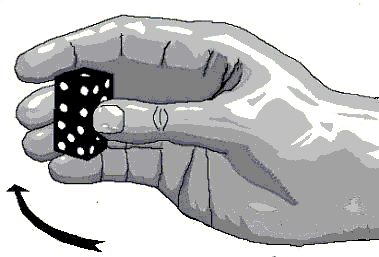 Control One of the cheat's moves to determine and control the outcome of a throw of two dice is known as the Whip Shot. Learn how cheats can guarantee what numbers are thrown. Also known as the Peek Shot, the Pique Shot, the Drop Shot and the Hudson Shot. This shot takes more skill than the simple Blanket Roll, but a cheat will make great effort to learn this shot because he can control with certainty the numbers thrown. It doesn't merely change the odds like the Blanket Roll, it sets the result as almost certain with the right conditions. The cheat will pick the dice up and hold them in a Lock Grip with the desired numbers on the dice facing upward. They are given a false rattle, then the cheat rolls the dice forward with his thumb towards his fingertips (as shown in the diagram). The cheat then snaps out his wrist with the motion of snapping a whip and throws the dice, but so that the dice spin rapidly like spinning tops without turning along the horizontal axis. The dice then land with the desired faces facing up. To prevent the dice bouncing on a hard surface, the cheat may sprinkle salt or sand on the throwing area, so they slide, or generally soften the surface where the dice are thrown.